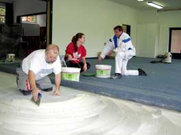 Kraftakt die Verlegung eines neuen Teppichbodens, der von der Gemeinde